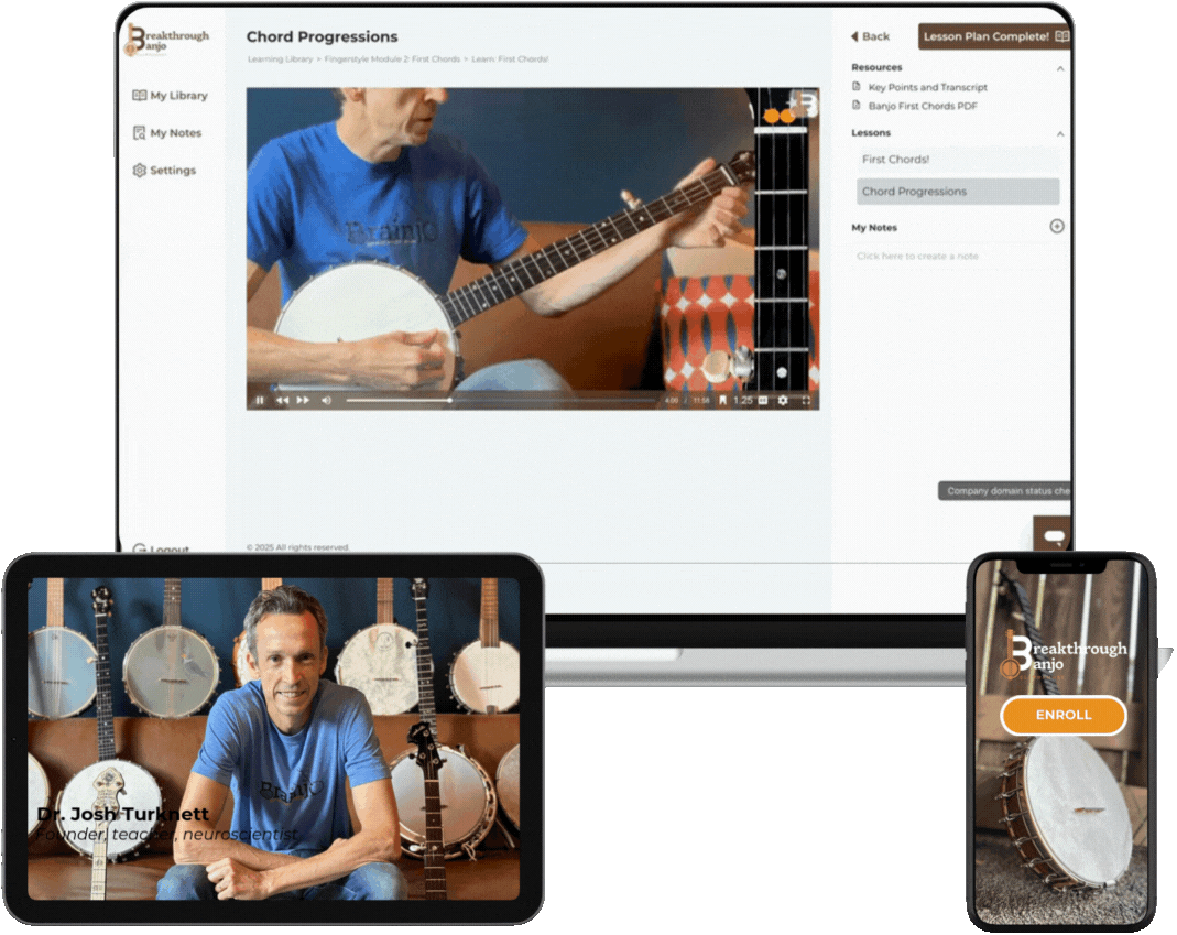 My neuroscience-backed approach is based on how brains naturally learn, making it intuitive and enjoyable to develop a knack for banjo. Frustrated with tab memorization and complex tutorials? Complete beginner? This path is for you.